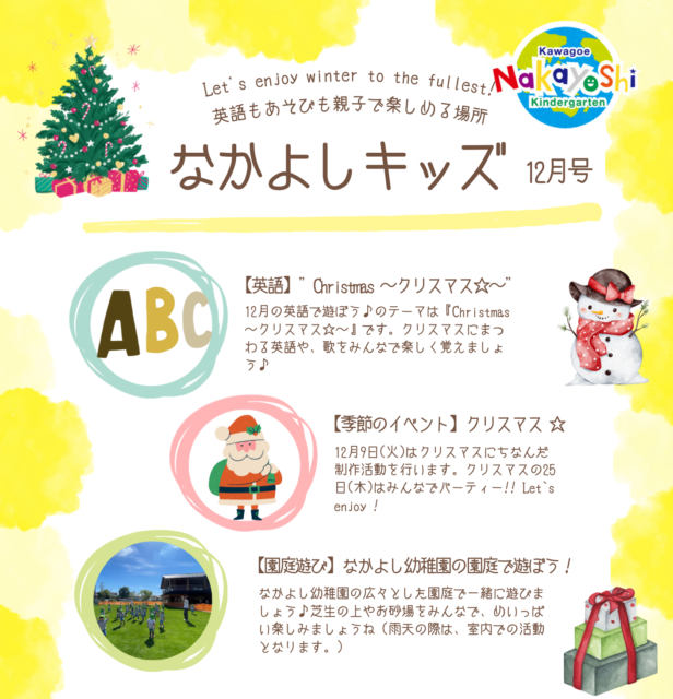 12月の親子プレ幼稚園「なかよしキッズ」の 開催日程をお知らせいたします! ※11月より参加対象クラ[...]